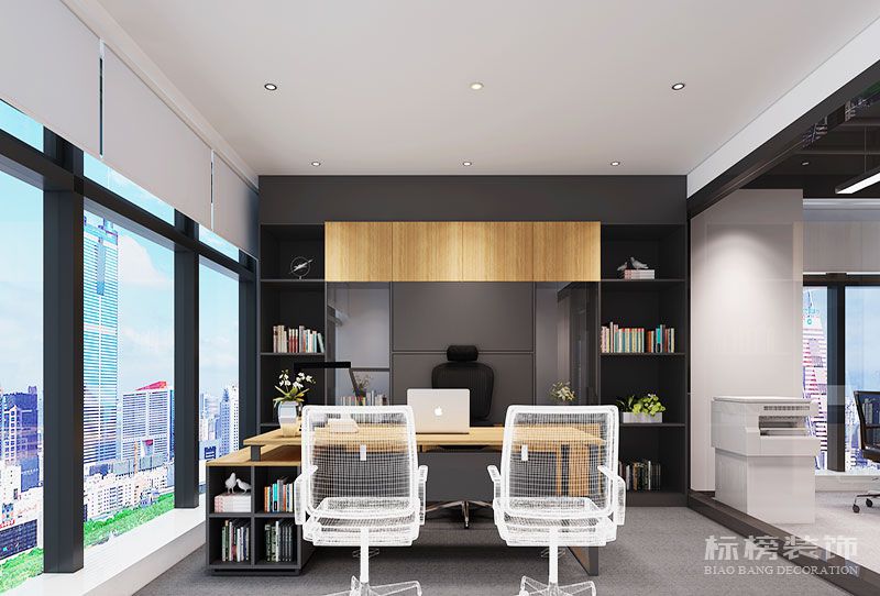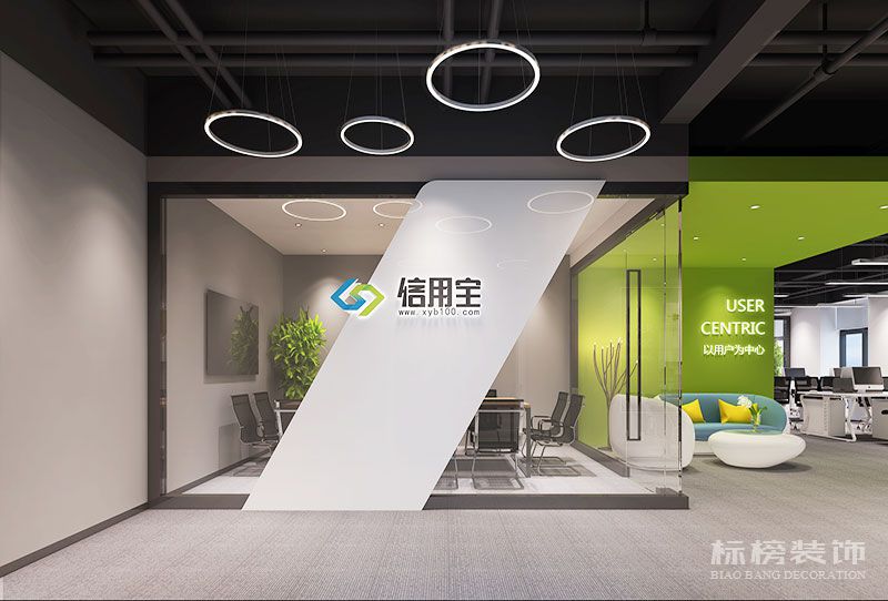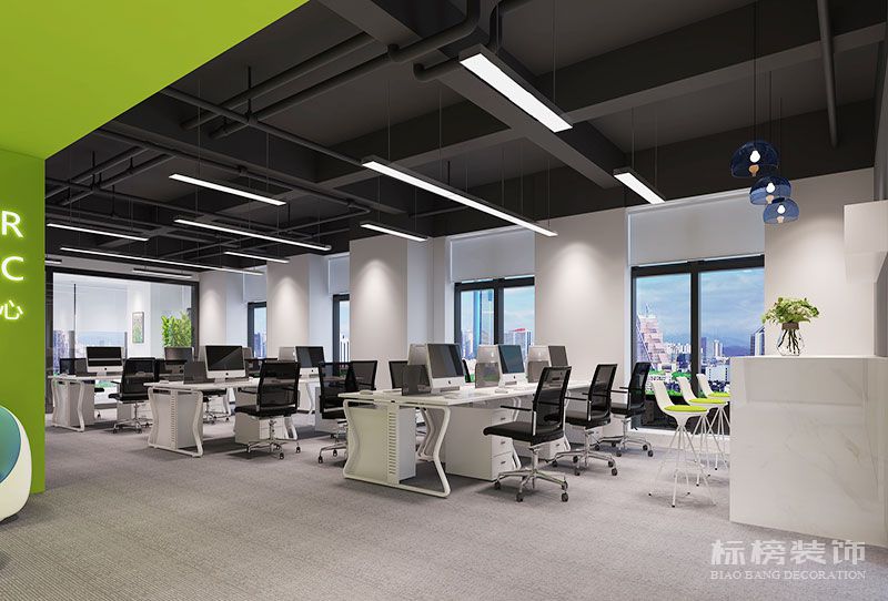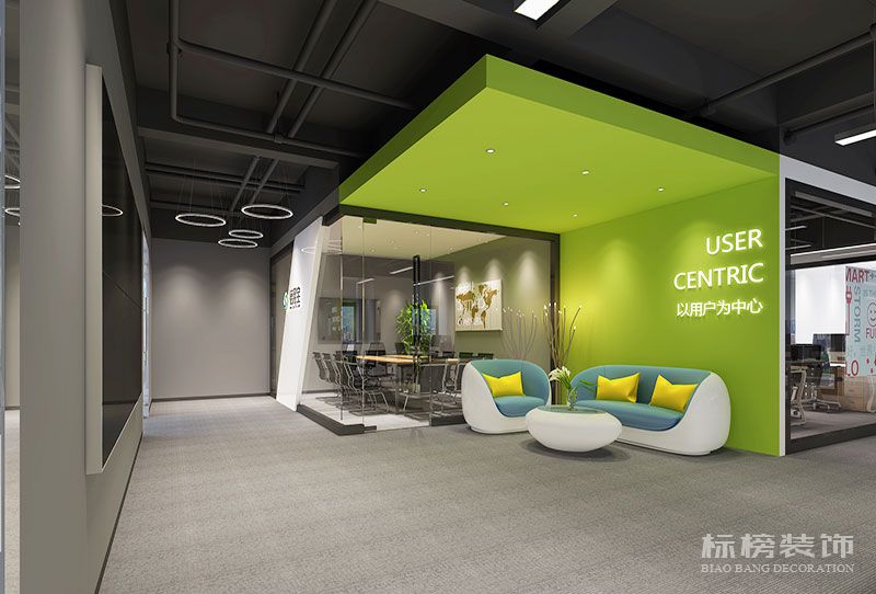 此办公室主要以白色为主,灰色与绿色来点缀空间,多采用玻璃隔墙来区分区域,后期玻璃上将贴关于公司文化磨砂纸,既能有个人的私密性,又能展示公司的文化。办公室照明以吊线灯为主,简单美观又能足够的明亮。